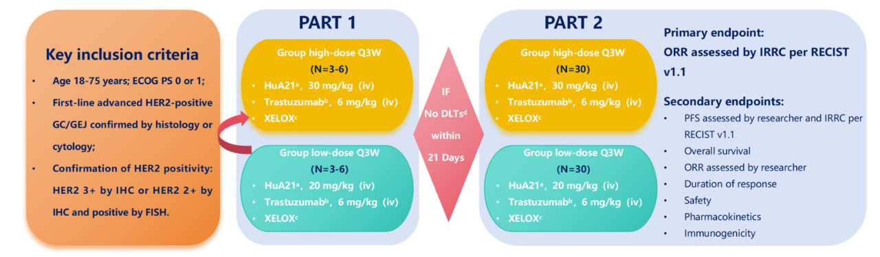 本研究是一项Ib/II期剂量递增与扩展临床试验,旨在评估HuA21(20/30 mg/kg)联合曲妥珠单抗及XELOX化疗方案,用于治疗HER2阳性晚期胃/胃食管交界处腺癌的安全性、耐受性及初步疗效。
