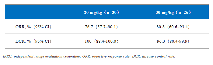 20 mg/kg(n=30)30 mg/kg(n=26)ORR, %(95% CI)76.7(57.7–90.1)80.8(60.6~93.4)DCR, %(95% CI)100(88.4-100.0)96.3(80.4-99.9)IRRC, independent image evaluation committee; ORR, objective response rate; DCR, disease control rate.