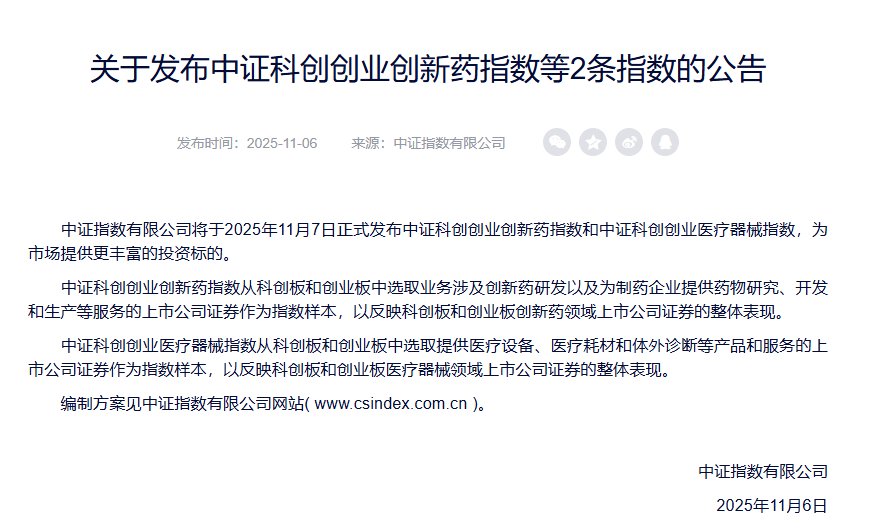 2025年11月7日,中证指数有限公司正式发布“中证科创创业创新药指数”,该指数从科创板和创业板中选取业务涉及创新药研发及相关服务的上市公司证券作为指数样本,旨在反映科创板和创业板创新药领域上市公司证券的整体表现。此次发布的指数共纳入50家上市公司,安徽安科生物工程(集团)股份有限公司入选成份股。