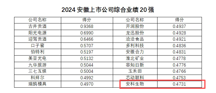 深厚的技术积淀与完整的产业体系,为安科生物长期高质量发展奠定了坚实基础。本次发布的“2024安徽上市公司综合发展能力50强”榜单中,安科生物位列其中,稳居区域上市公司中上游梯队,综合实力与持续竞争力获得权威认可。