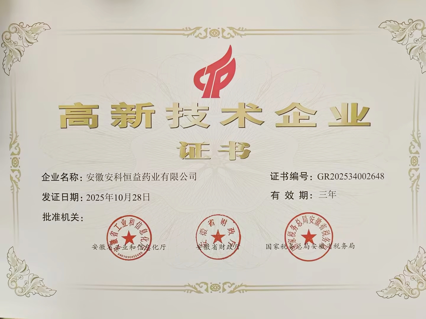 近日,安徽安科生物工程(集团)股份有限公司全资子公司安徽安科恒益药业有限公司顺利通过高新技术企业重新认定,并获得由安徽省工业和信息化厅、安徽省财政厅、国家税务总局安徽省税务局联合颁发的《高新技术企业证书》,证书编号GR202534002648,有效期三年。本次认定系安科恒益原高新技术企业证书有效期满后的重新认定,标志着安科恒益在技术创新、研发实力及成果转化等核心竞争力方面持续获得权威认可。