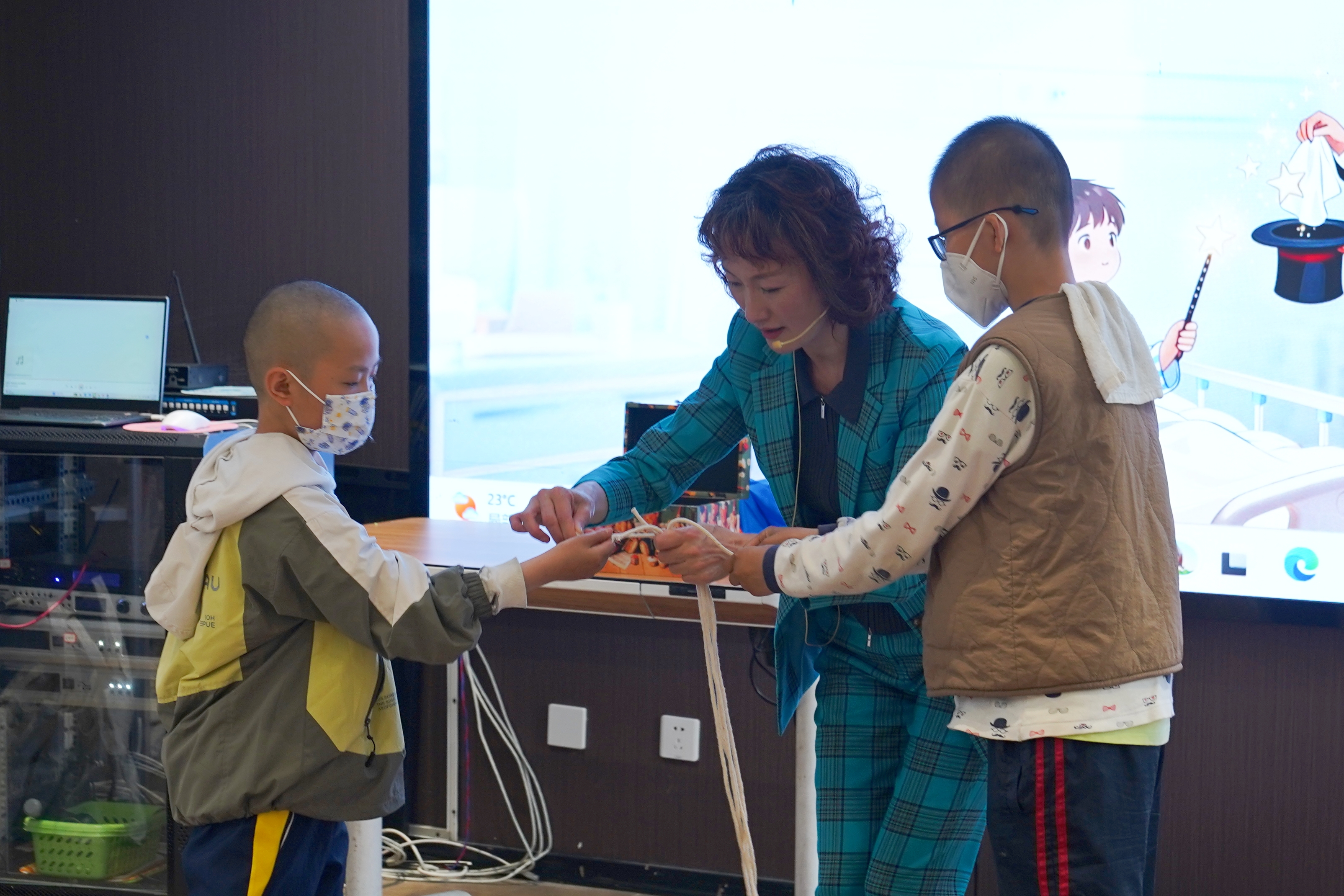 在活动室,魔术师们用一个个精巧的小魔术和活泼的互动,迅速点燃了现场气氛,瞬间吸引了孩子们的注意力。橡皮筋在指尖穿梭跳跃,铁链与铁环在掌心神奇锁合又解开……惊叹声与欢笑声此起彼伏,孩子们从最初的羞涩拘谨变得踊跃举手,积极参与其中。