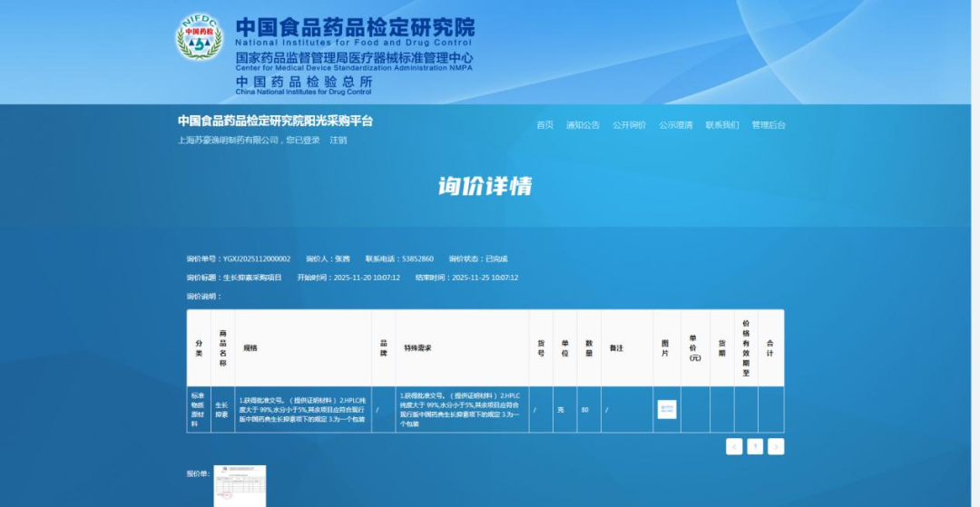 2025年11月20日,中检院公开询价采购生长抑素标准物质原料,发布生长抑素标准物质原料询价公告,诚邀符合项目技术要求、资格要求的供应商参加。作为国内多肽原料药领域的重要企业,苏豪逸明积极响应、精心筹备,于12月11日正式收到官方中选通知。